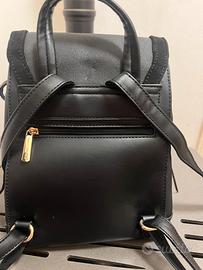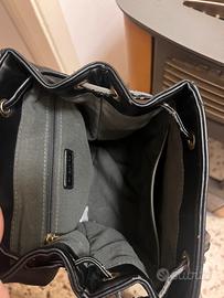 Zaino con chiusura con laccetti che purtroppo nonostante lo zaino è stato usato poche volte, si sono un pó spellati! Lo zainetto non è grandissimo, presenta una tasca dietro e anche all’interno!