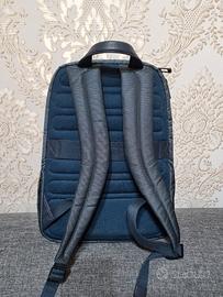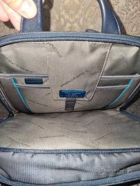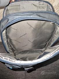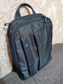 Zaino della collezione P16 di Piquadro, grigio con particolari in pelle blu. Il compartimento porta notebook è imbottito Tasca esterna porta bottiglia ripiegabile e porta ombrello Tasche interne porta cellulare e porta penne. Sistema d'aggancio ai trolley con cordella. 40x30x13cm