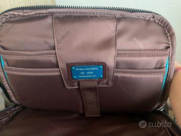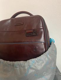 Zaino porta computer e porta ipad della collezione Blue Square Revamp di Piquadro, realizzato in pelle naturale, dotato di due comparti con chiusura con cerniera, tasche laterali porta ombrello/bottiglia, schienale traspirante dotato di tasca per aggancio al trolley, spallacci imbottiti e regolabili.