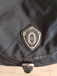 Zainetto nero Pollini con trama a rombo nell'esterno, finiture in pelle. Il logo molto bello in oro e nero completano questo elemento moda. Misure: larghezza cm. 29, altezza cm. 32