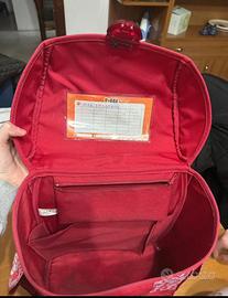 Zaino scolastico rosso con una simpatica stampa floreale e un gatto applicato.