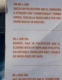 Vendo Sacca in polietilene 600 D - chiusura a strozzo con " cannocchiale " ferma corda - tracolla regolabile per uso zaino/sacca in nastro. Condizioni ottime adatta alla stagione estiva per il mare e le gite in barca o escursioni in montagna. Compresa di cartellino attaccato con misure. Vige regola visto piaciuto e preso. No perditempo e affaristi grazie!!!