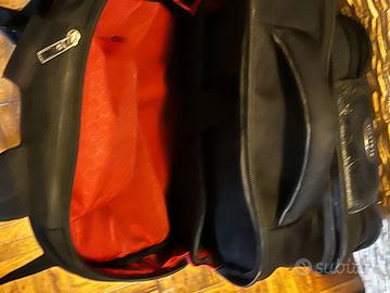 Purtroppo mi si e` rovinato uno spallaccio, vedasi foto, e richiederebbe una sistemata da qualcuno che sa cucire. Con un po' di lucido da scarpe sulla pelle poi ritorna nuovo.