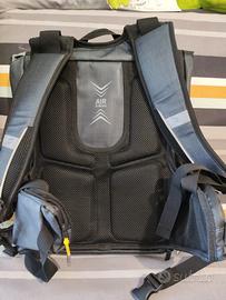Schienale con sistema AIR STREAM per la circolazione dell'aria, spallacci ergonomici con assorbimento degli urti e cinghie regolabile all'altezza dello sterno e sulla vita per stabilizzare il peso dello zaino sulla schiena.