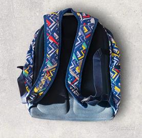 •Colore: Base blu con pattern geometrici giallo, rosso e azzurro.