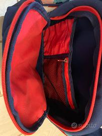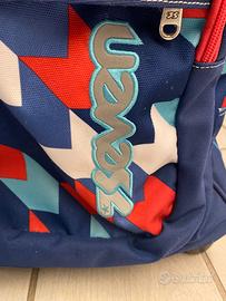 Zaino Seven con fantasia rosa e azzurra, con rotelle e con taschino sul davanti. Condizioni buone, rovinato in fondo alle bretelle.