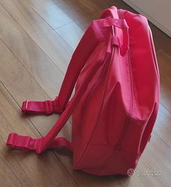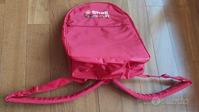 Zaino Shell originale Ferrari in tela resistente e impermeabile. Rosso Ferrari, gadget ufficiale, nuovo, mai usato. Misure idonee per bagaglio a mano aereo. Apertura con cerniera, tasca esterna con zip, comodi manici imbottiti. Anche per collezionismo.