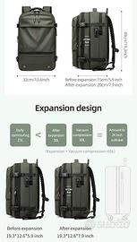 Vendo Zaino Sottovuoto Viaggio Con Pompa, Aereo Bagaglio a Mano Borsa da Cabina per Donna Uomo Zaini 17 Pollici Porta PC Casual Impermeabile lucchetto Daypack 【Compressione sottovuoto】: Il sacco sottovuoto è dotato di una valvola unidirezionale. È possibile scegliere la nostra pompa elettrica per una compressione rapida o premere manualmente per rilasciare l'aria, riducendo così lo spazio sprecato tra i sacchi sottovuoto di espansione. Massimizza l'utilizzo dello spazio del bagaglio. 【Bagaglio a mano approvato per il volo】: Può essere espanso fino a una capacità di 60 litri tramite compressione sottovuoto, equivalente a un trolley da 24 pollici. Le sue dimensioni sono di soli 12 * 7,8 * 20 pollici. Non è necessario effettuare il check-in, puoi portarlo direttamente in aereo. 【Tasche multiple】Lo zaino da viaggio è dotato di diverse tasche, tra cui una zona di separazione bagnato/asciutto, un sacchetto di compressione sottovuoto, una borsa portaoggetti combinata, uno scomparto indipendente per laptop (può contenere laptop da 17 pollici), una tasca posteriore antifurto con cerniera e anche una tasca con password, offrendo una maggiore protezione per i tuoi effetti personali. 【Design confortevole】Lo zaino da viaggio è progettato con un cuscino anti-pressione sul retro, che lo rende più comodo e facile da trasportare. Il design a rete a nido d'ape garantisce una buona traspirabilità, mantenendoti fresco e comodo anche durante i lunghi viaggi. 【Materiale resistente】: Realizzato in tessuto Oxford ad alta densità e strato impermeabile laminato, è antigraffio e impermeabile. Se bagnato, basta asciugarlo delicatamente con un tovagliolo di carta e si asciugherà. È perfetto per zaini da college, zaini da viaggio per il fine settimana, zaini da viaggio in aereo, zaini da lavoro professionali ed è un regalo perfetto per i viaggiatori.
