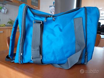 Zaino con spallacci con ampio scomparto centrale, due anteriori ed uno posteriore. Con un sistema di zip si può trasformare all'occorrenza in un capiente borsone, resistente ed impermeabile. Lunghezza cm 53, profondità 33 cm, altezza cm 43. Manici regolabili. Perfetto. Nuovo. Marca Delsey. Colore azzurro scuro.