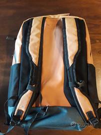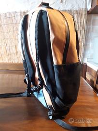 Zaino arancione, vari scompartimenti, impermeabile, utile per l'università.