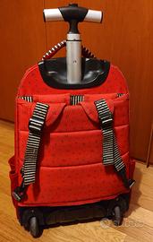 Ha schienale ergonomico, spallacci imbottiti, regolabili ed a scomparsa, maniglia in tessuto e manico trolley retraibile, regolabile in altezza (fino a 100cm) e base monoblocco in plastica dura con 2 piedini e 2 rotelle.