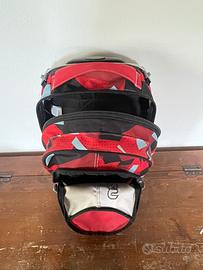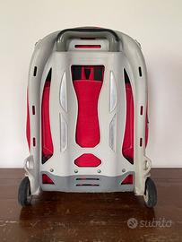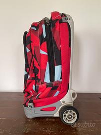 Zaino trolley a due ruote, rosso,nero con dettagli azzurri, leggermente strisciato sul fondo. Il manico telescopico funziona e sale agevolmente, per la chiusura del manico è necessario premere bene il bottone situato sopra. È inoltre sganciabile, ció permette di metterlo anche sulle spalle.