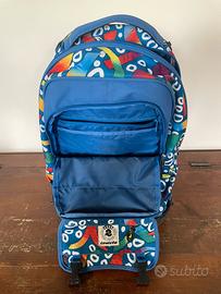 Zaino trolley a due ruote, blu con dettagli bianchi e colorati, leggermente strisciato sul fondo. Il manico telescopico funziona e sale agevolmente, per la chiusura del manico è necessario premere bene il bottone situato sopra. È inoltre sganciabile, ció permette di metterlo anche sulle spalle.