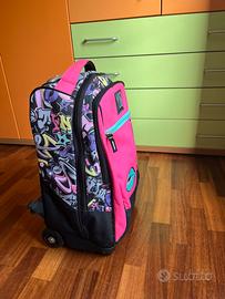 È molto capiente, ideale per libri, quaderni e tutto il materiale scolastico. Dotato di manico estraibile e rotelle resistenti, oltre a spalline regolabili per usarlo comodamente sulle spalle quando necessario.
