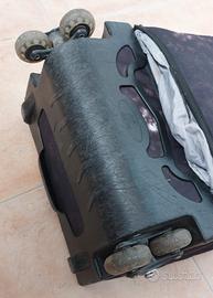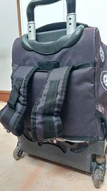 Zaino trolley per la scuola con rotelle incorporate, copri rotelle da usare quando si porta sulla schiena e cinghie per la tracolla. Nelle parti in plastica ha graffi da usura come potete vedere dalle foto, ma comunque esteticamente accettabile e senza danni evidenti, leggermente difettosa la chiusura a scorrere del manico del trolley ma comunque funzionante.