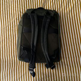 Zaino Trussardi Jeans color verde completo di dust bag. Dettagli delle chiusure color nero. Tasche anteriori chiuse con cerniera, internamente tasca porta pc. 100% poliestere. Spalline regolabili e retro imbottito e con sezione per agganciarlo alla valigia. Lieve segno sulla stampa anteriore come da foto. Contiene perfettamente un computer 13 pollici. Misure: altezza 41cm,larghezza37cm,profondità 14cm.