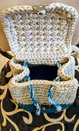 Zaino unico in fettuccia , lavorazione artigianale (fatto a mano).Nuovo. Misure: H 25cm x L23cm