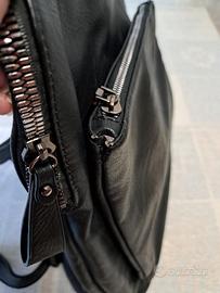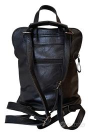 Zaino unisex dotato di molte tasche, sia interne che esterne. Doppia portabilità: a zaino e a borsa in spalla. Cinghie regolabili. Brand: non c'è nessuna etichetta, né del brand né del materiale. Colore: nero, interno argento. Misure: altezza e profondità cm 35 larghezza cm 29 fondo cm 30 x 10 Usato in ottime condizioni. Credo sia ecopelle Da segnalare: l'interno di una delle tasche interne ha delle macchie, che non sporcano e non hanno cattivo odore e leggerissima usura nel bordo vicino alla cerniera nella tasca davanti (vedere foto). Fornisco altre foto dettagliate su richiesta.