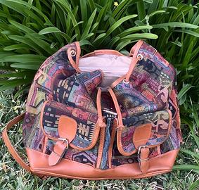 Zaino vintage in pelle e stoffa con motivo etnico sui colori caldi. Materiale in ottimo stato, pelle leggermente più scura sul fondo come da foto. Molto capiente, con tasche esterne e tasca interna. Misure: largo 36 cm, profondo 12 cm, alto 32 cm. Resto a vostra disposizione per domande o offerte sensate.