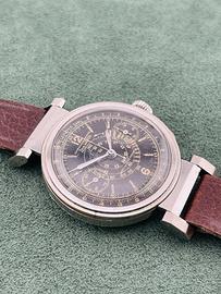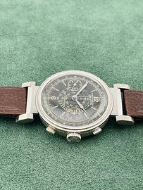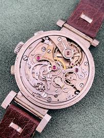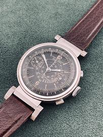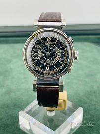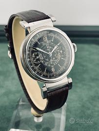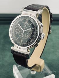 Zais Watch Chrono antimagnetic anni '30-‘40 con bellissima cassa art deco da 37mm fondo acciaio inossidabile e anse mobili, raro ed originale quadrante gilt nero con grafica dorata, con spettacolare patina del tempo, pulsanti cronografici a oliva e vetro plastica originale con lente magnificatrice centrale per ingrandire la scala tachimetrica a spirale. Movimento meccanico a carica manuale Landeron Hahn con ruota a colonne. Orologio in condizioni generali di conservazione e funzionamento più che ottime; venduto con cinturino per anse fisse in pelle testa di moro. Non si accettano scambi con Omega, Rolex, Breitling, Tissot, IWC, Tag Heuer, Zenith e altri marchi.