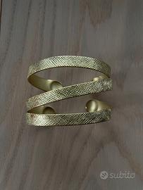 Versione bagno oro (finitura PVD resistente a graffi e ossidazione). Superficie martellata che cattura la luce; design a tripla spirale regolabile al polso. Pezzo statement elegante ma leggero.