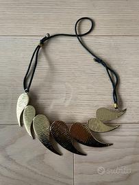 Versione bagno oro (finitura PVD gold-tone): superficie martellata a effetto liquido con 7 elementi a goccia su laccio regolabile in tessuto. Scultura da indossare, perfetta su maglie e abiti semplici.