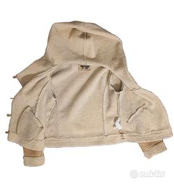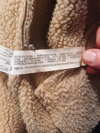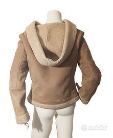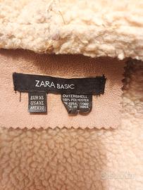 Giacca Zara Basic in finta pelle scamosciata effetto shearling, color cammello/beige. Stile duffle coat con ampio colletto/cappuccio integrato, chiusura asimmetrica con 5 alamari, una tasca esterna. Polsini, orlo e interno in eco-montone beige morbido e caldo.