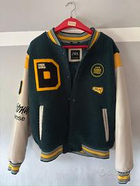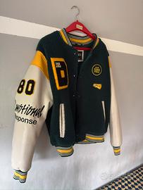 Giacca varsity stile college - colore verde scuro, maniche in ecopelle bianca e dettagli gialli.