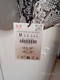 Splendida borsa a spalla modello "baguette/barrel" firmata ZARA, originale e mai indossata, ancora munita di cartellino originale (prezzo retail $49.90 / £29.99). Design: Iconica stampa animalier (pitone) sui toni del grigio, bianco e nero. Un pezzo intramontabile, perfetto sia per look casual che eleganti. Condizioni: Nuova con etichetta. La borsa è immacolata, tracolla ancora perfettamente piegata e interni pulitissimi (vedi foto). Dettagli: Chiusura con zip, molto versatile e leggera da portare. Un'ottima occasione per aggiudicarsi un pezzo Zara nuovo a un prezzo imbattibile. Spedizione rapida e imballaggio curato.