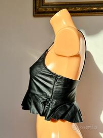 Crop top nero di Zara in similpelle. Non è imbottito e le spalline non sono regolabili. Chiusura a zip laterale.