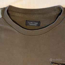 Particolare felpa Zara in stile “Utility/Techwear”, color verde fango/khaki scuro. Tasca frontale con fibbia, bande a contrasto lungo le maniche e cinghie con anelli a D sul retro.