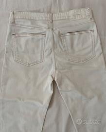 jeans in denim bianco 100% cotone con un taglio straight fit, con vestibilità regolare. La chiusura è a zip con bottone, mentre il design a cinque tasche include due tasche frontali, una portamonete e due posteriori.