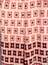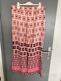 Pantalone bellissimo e stiloso, sembra uscito da un’atelier di un famosissimo marchio di lusso francese, fondo rosa con disegni stilizzati effetto monogram. Chiuso in vita con cerniera, taglia XL, ottimo
