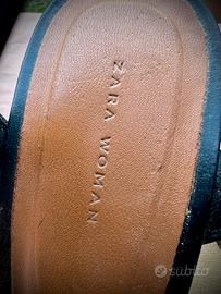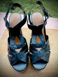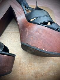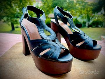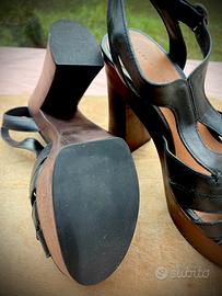 ZARA WOMAN, sandali neri in pelle con tacco e zeppa in legno n.39, stile anni ‘70.