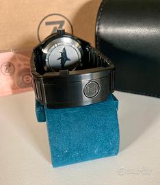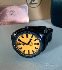 La lunetta presenta un inserto in ceramica, il quadrante è dotato di una luminescenza arancione, mentre la cassa e il bracciale sono rivestiti da un strato nero DLC.