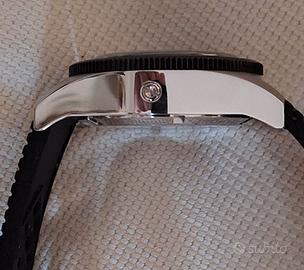 Corredo con bellissima scatola legno - rotolo di orologio in pelle ingrassata/tela - strumento per la sostituzione del cinturino – cinturino gomma originale con fibbia ad ardiglione logata più cinturino in tela gommta extra – card in metallo e scheda di garanzia