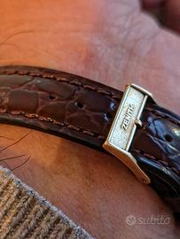 Caratteristiche Principali: Cassa 34mm escluso corona Realizzata interamente in oro massiccio 18 carati (750). La cassa è punzonata e presenta una splendida finitura lucida. Il peso della sola cassa (senza movimento) è di circa 12,5 grammi. Quadrante: Color champagne/argento con lavorazione sunray (a raggio di sole). Indici a bastone applicati in oro e l'iconica stella Zenith a ore 12. L'orologio è montato su un cinturino di alta qualità , che si abbina perfettamente all'oro della cassa. Corona originale. Movimento: Calibro automatico di manifattura Zenith a 30 rubini. Un movimento robusto e raffinato Condizioni: L'orologio si presenta in condizioni eccellenti per la sua età. Quadrante pulito, cassa con spigoli vivi e movimento brillante. Funziona molto bene