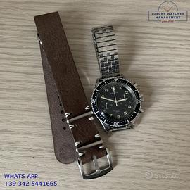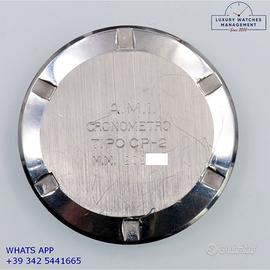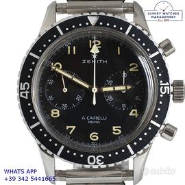 Zenith cronografo A.M.I. CP-2 by CAIRELLI assegnato militare acciaio, anno di produzione 1960 circa, ghiera acciaio bidirezionale virata colore marrone, vetro plastica bombato antiriflesso, quadrante opaco colore nero con indici arabi e sfere al trizio, originale Zenith mai ritoccato o ristampato, movimento meccanico a carica manuale, bracciale generico acciaio elastico dell’epoca, più altro cinturino vintage modello NATO in pelle di vitello colore marrone con fibbia generica acciaio.