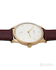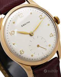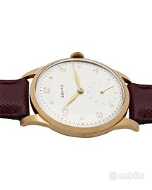 Zenith Classic vintage rose gold 34 mm cal 126-6; Peso: 31,72gr; Misura: 15/20 cm; Materiale: Oro rosa; Anno: 1950 (circa); Corredo: Scatola e Garanzia del rivenditore; Referenza: 999; Carica: Manuale; Calibro: 126-6; Rubini: 15; Colore quadrante: Bianco; Corona: Oro rosa; Diametro cassa: 34mm; Ghiera: Oro rosa Materiale cassa: Oro rosa; Materiale cinturino: Pelle; Vetro: Plastica Cod: 7263-a