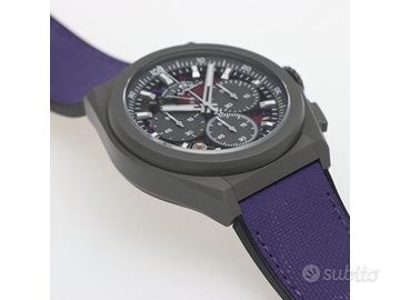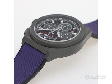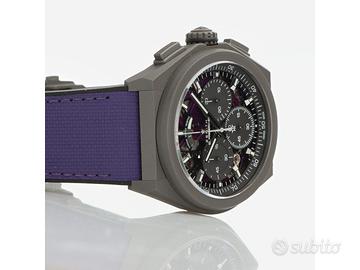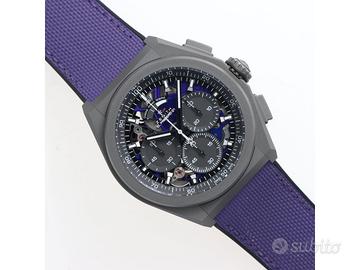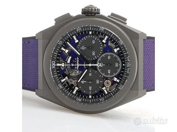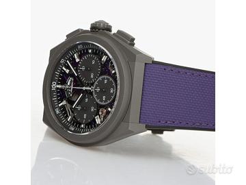 Clover Gioielli pone in vendita Zenith Defy El Primero Ultraviolet 97.9001.9004 realizzato in titanio, cassa di diametro 44 mm. Lunetta, corona di carica e pulsanti in titanio. Cinturino in caucciù viola e nero. Orologio in condizioni eccellenti. Full Set. Garanzia 05/2021.