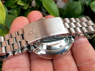GUARDA ANCHE GLI ALTRI MIEI ANNUNCI,POTRESTI TROVARE IL SEGNATEMPO CHE STAI CERCANDO! SE L’INSERZIONE È VISIBILE L’OROLOGIO E’ DISPONIBILE LEGGI TUTTO! Prezzo non trattabile ! ( GENTILMENTE NON CHIEDETE ) Zenith Ufo o Disco Volante Referenza 01.1180.290 Orologio completamente originale Cassa da 40 millimetri ad esclusione della corona di carica,dial blu navy e sfere originali in ottime condizioni ( i lievissimi segni che si vedono sono sul vetro originale e non sul quadrante ),corona originale ok,fondello a vite ok,cassa originale,datario ad ore 4 ok,movimento originale zenith cal.2562PC 28800 a/h a carica automatica perfettamente funzionante con buona tenuta del tempo e riserva di carica,bracciale originale per polsi fino a 19 cm.,non possiedo scatola e card garanzia. PREZZO NON TRATTABILE! NO PERDITEMPO