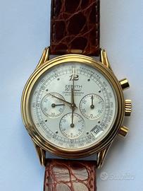 Cronografo automatico Zenith El Primero in perfette condizioni, cassa in acciaio 37mm, placcato oro, quadrante argento, anno di produzione 1992, fondello con chiusura a scatto, con datario e 3 contatori, movimento meccanico Zenith 400-31 rubini, cinturino in pelle con chiusura originale Zenith.