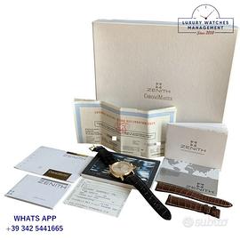 Zenith El Primero cronografo Chronomaster oro giallo 18KT, anno di produzione 1997, ghiera oro giallo 18KT a scalino liscia, vetro zaffiro antiriflesso, quadrante soleil colore argento con data e tre contatori, movimento meccanico a carica automatica El Primero, cinturino alligatore lucido colore nero con fibbia oro giallo 18KT Zenith, più altro cinturino alligatore colore marrone Zenith.