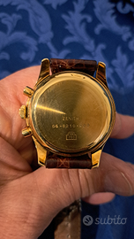 Movimento automatico, cassa in oro giallo 18kt ,usato pochissimo !! ( bollino sul fondello tolto da poco e conservato ),tasti a pompa in oro ,quadrante con fondo bianco argentato e numeri romani applicati in oro 18 kt , scala tachimetrica,cinturino in pelle ed ardiglione in oro giallo 18 kt originali Zenith !! .