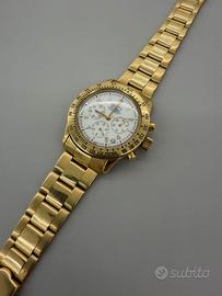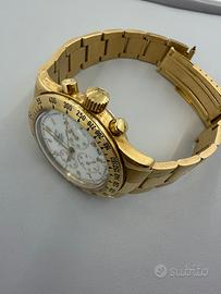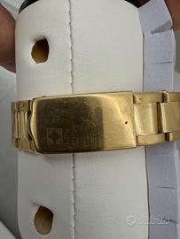 Zenith El Primeto cassa e bracciale in oro a 18kt Referenza: 06.0050.400 Anno: 1980 Ghiera: Con scatola tachimetrica Corona: a vite originale Movimento: Automatico 400 El Primero Diametro cassa: 40mm Vetro: Plexiglas Materiale: Oro 18kt sprovvisto di garanzia e scatola. POSSIBILE LUCIDARE SU RICHIESTA