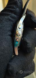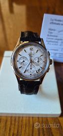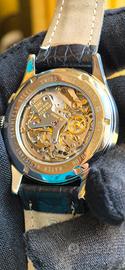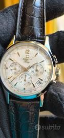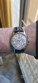 Vendo dalla mia collezione privata Zenith Prime cronografo con movimento automatico cal. 420 ad alta frequenza 36.000 alternanze/ora, elegante orologio svizzero con meccanica di altissimo livello, derivato dall’iconico El Primero. Dettagli principali: Quadrante: bianco argenté con tre contatori cronografici e datario tra 4 e 5 Cassa: acciaio inossidabile lucido, vetro minerale poiché questa versione non montava il vetro zaffiro per mantenersi più economico del fratello maggiore el primero Fondello: a vista, permette di ammirare il movimento Zenith cal. 420 Cinturino: pelle nero, fibbia ad ardiglione entrambi non originali Movimento: Meccanico, alta frequenza, estremamente preciso e affidabile fino a 50 ore di riserva di carica Condizioni: ottime, orologio perfettamente funzionante in maniera impeccabile, ultima revisione fatta a febbraio 2025 qualche lieve segno di usura, cinturino si consiglia la sostituzione poiché un pò usurato, notasi anche il quadrante leggermente invecchiato dal tempo che lo rende altrettante unico ed affascinante. Perché acquistarlo: un cronografo storico e moderno allo stesso tempo, perfetto per collezionisti e appassionati Zenith, con una meccanica alta frequenza rara da trovare in condizioni così curate.