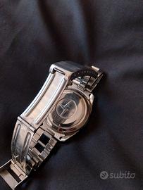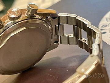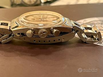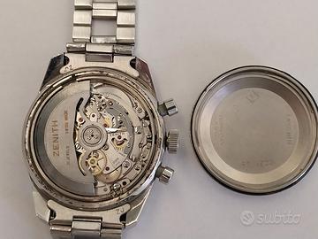 Splendido Zenith "El Primero" Ref. A386 Mark III del 1971, originale in ogni sua parte, corredato da bracciale Gay Freres e da custodia rossa originale. Molto raro e difficile da trovare in queste condizioni...come si può evincere dalle foto in allegato Di seguito qualche informazione tecnica: QUADRANTE: Quadrante tricolore con base argentata e contatori blu, grigio e argento. Finestra della data tra le 4 e le 5. Lancette bianche con lancetta dei secondi cronografo centrale rossa. Anello tachimetrico esterno bianco. CASSA: 37mm in acciaio inossidabile con retro a vite. MOVIMENTO: Calibro 3019 PHC, Movimento cronografo meccanico a carica automatica con 31 rubini BRACCIALE: Gay Freres Spettacolare segnatempo vintage rappresenta ,a parte la oggettiva bellezza e rarità, un ottimo investimento in questo periodo di turbolenze economiche Usato da me molto poco, sempre tenuto in cassetta di sicurezza