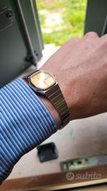 Orologio anni ’80, realizzato in acciaio e placcato oro, dalle finiture eleganti e di alta qualità e con movimento al quarzo. In condizioni eccellenti, completo di scatola e libretto di manutenzione e uso.