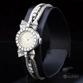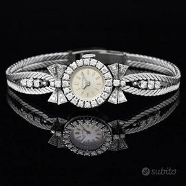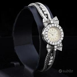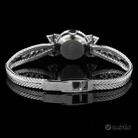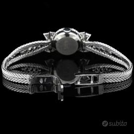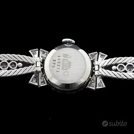 anni 60 in oro bianco 18 kt 750 braccialato cassa di 17 mm escluso corona brillanti su lunetta e bracciale , taglio rotondo a brillante 1.14 ct H color IF vetro plexy quadrante argento bracciale in oro bianco 18 kt circonferenza polso 17 cm peso orologio 26,4 grammi movimento meccanico a carica manuale calibro Z1110 perfettamente funzionante revisionato originale (non trattiamo falsi) in ottime condizioni !! rilasciamo fattura di vendita nella quale certifichiamo l'orologio spediamo gratis in tutto il mondo