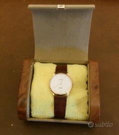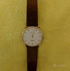 ZENITH (made in Swiss), collezione Silhouette, orologio da polso unisex, movimento al quarzo, alimentato a batteria, cassa in acciaio inossidabile, laminato in oro, diametro 34 mm., spessore massimo 4 mm., fondo cassa in acciaio inossidabile, quadrante bianco, lancette laminate in oro, vetro minerale, cinturino marrone in pelle di lucertola, impermeabile, stile elegante, (foto 1, 2, 3). Vintage, anni 90. Confezione originale, senza istruzioni, senza garanzia attiva, (foto 4, 5). Nuovo, funzionante. Batteria nuova. Precisione assoluta. Spedizione in Italia a EUR 1,00 (spedizione gratuita non ammesssa da Subito) Eventuale ritiro gratuito da concordare a San Felice sul Panaro (MO). Pagamento anticipato anche in caso di ritiro. Pagamento immediato